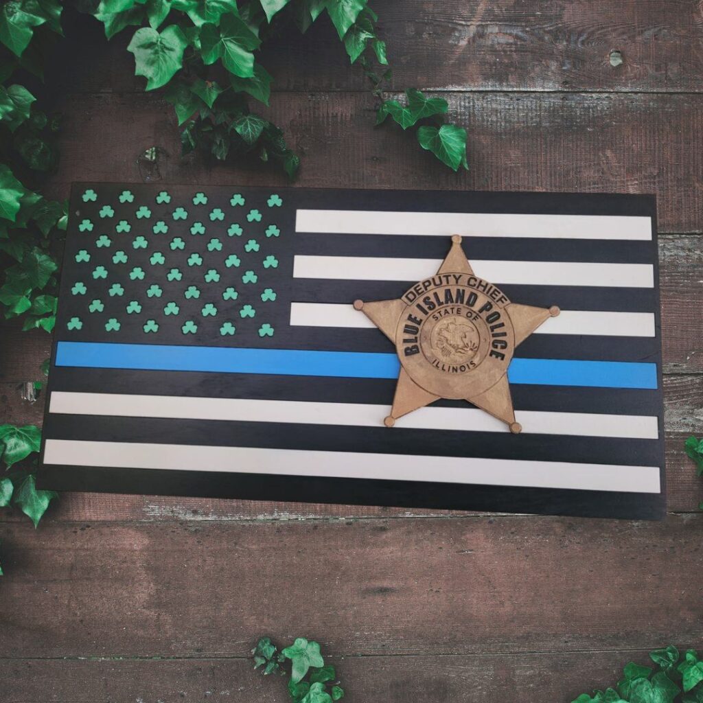 We were asked to create a design including the “thin blue line” police flag with shamrocks instead of stars and a replica of a specific officer’s badge. This is what we delivered to the customer.